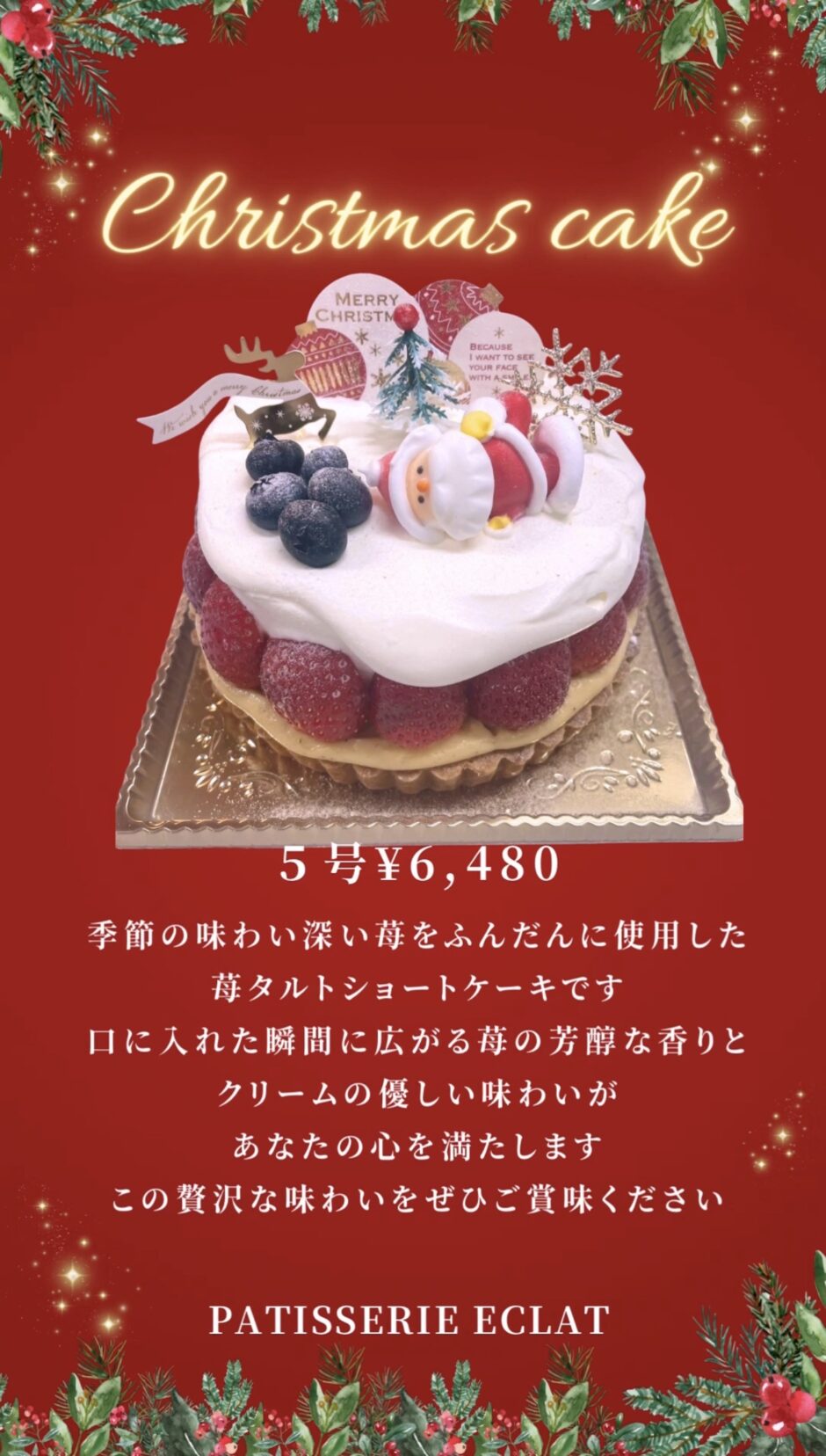 口に入れた瞬間に広がる苺の芳醇な香りとクリームの優しい味わいが、あなたの心を満たします。この贅沢な味わいをぜひご賞味ください🎄