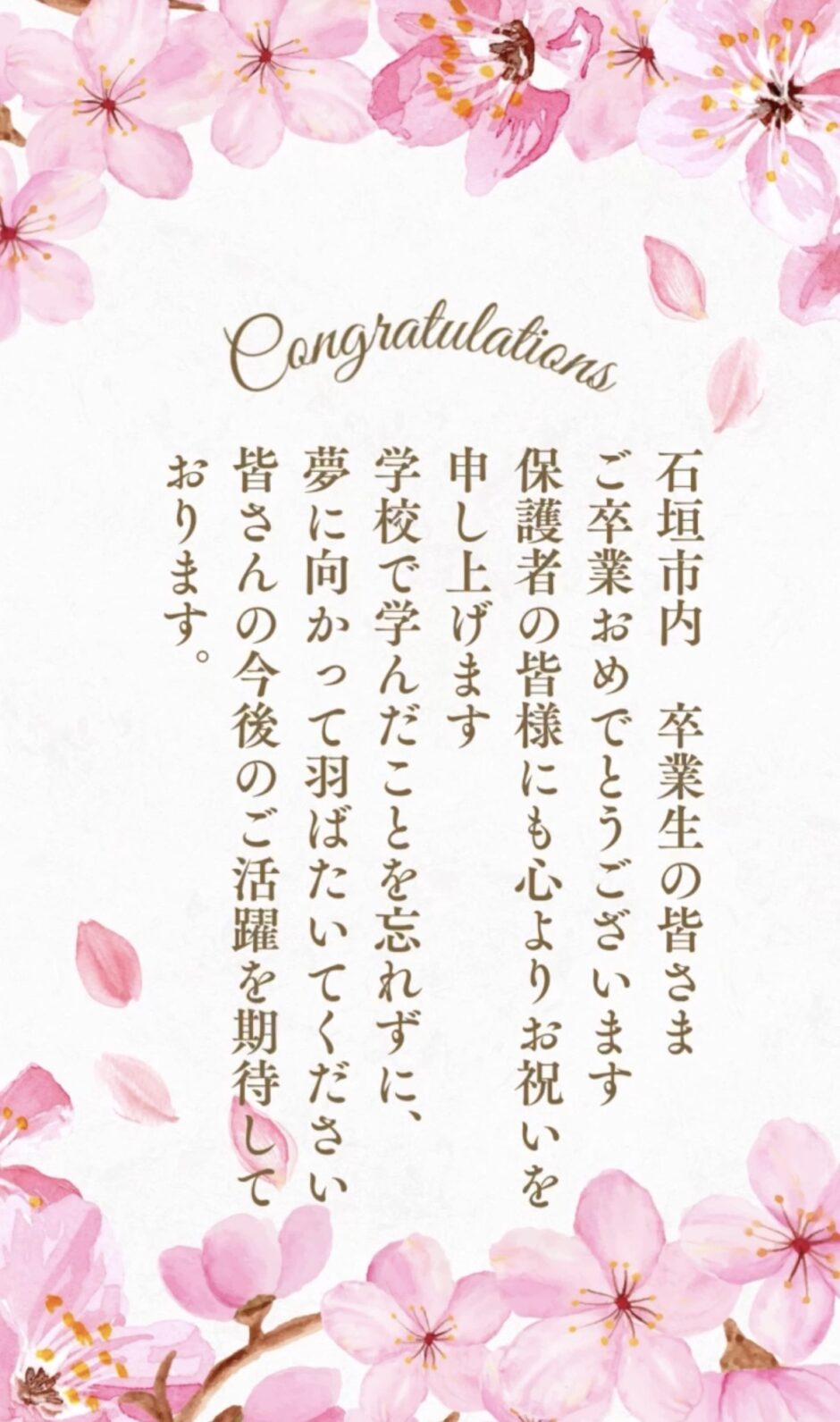 石垣市内卒業生の皆さま、ご卒業おめでとうございます。