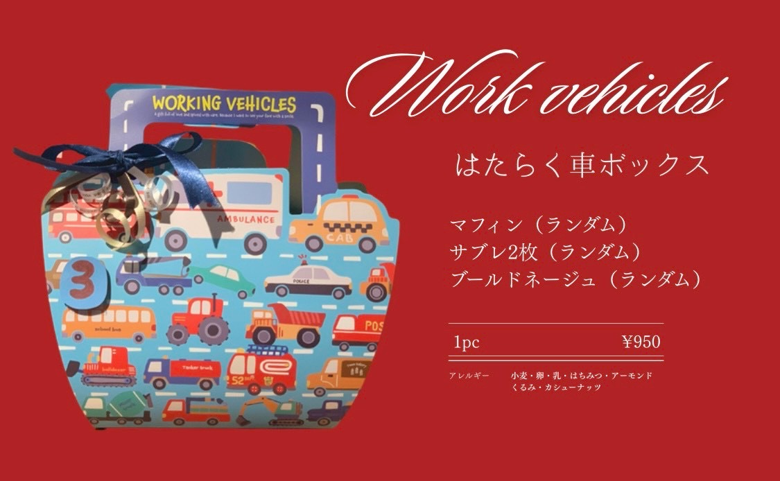「はたらく車ボックス」は、車が好きなお子さまに喜ばれる、ポップでかわいい焼き菓子ギフトです。マフィンやサブレ、ブールドネージュが入った楽しい詰め合わせです。