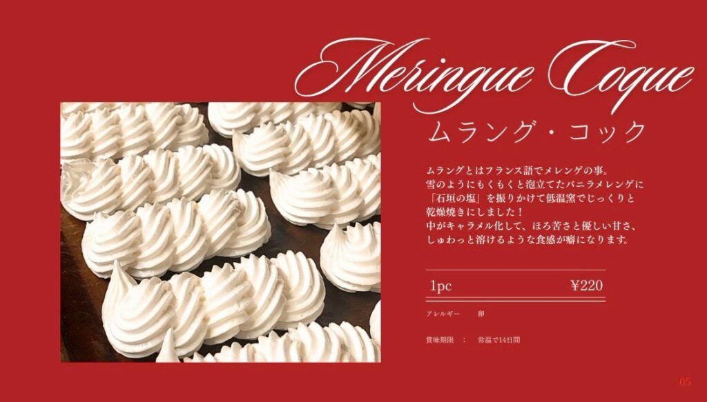 「ムラング・コック」は、メレンゲを低温でじっくり乾燥焼きにした、軽やかな食感のお菓子です。口の中でしゅわっと溶けるような食感と、やさしい甘さが魅力です。