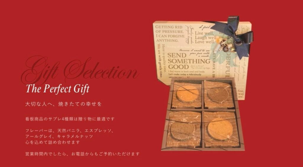 看板商品のサブレ4種類は、贈り物に最適です。天然バニラ、エスプレッソ、アールグレイ、キャラメルナッツなど、香り豊かな味わいを詰め合わせることで、大切な方へ焼きたての幸せをお届けします。