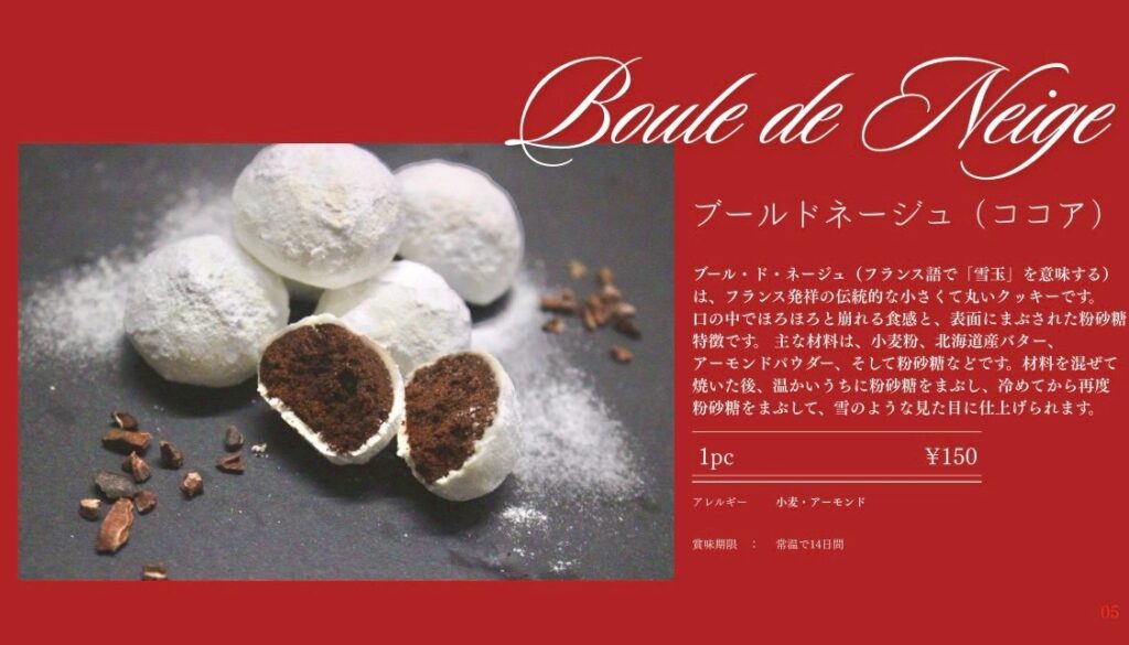 「ブールドネージュ」は、フランス語で“雪玉”を意味する小さくて丸いクッキーです。口の中でほろほろと崩れる食感と、粉砂糖をまとった見た目が特徴で、ココアの香りを楽しめる人気の焼き菓子です。