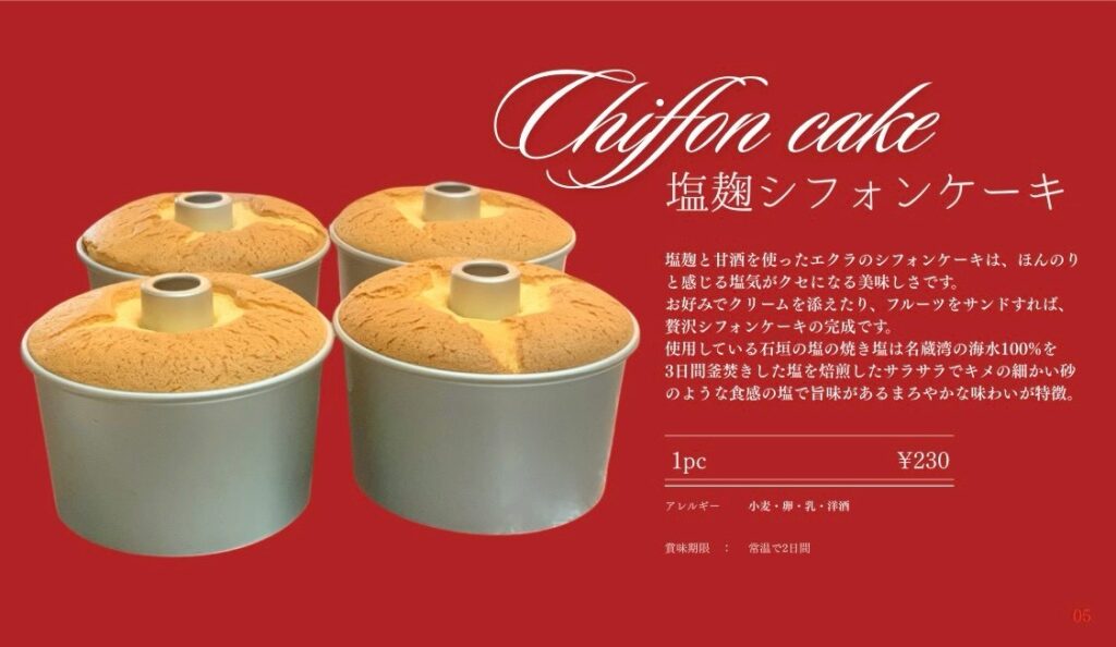 特に「塩麹シフォンケーキ」に使われている石垣の塩は、石垣島・名蔵湾の海水100%を3日間釜焚きして作られた、まろやかな旨みのある塩です。